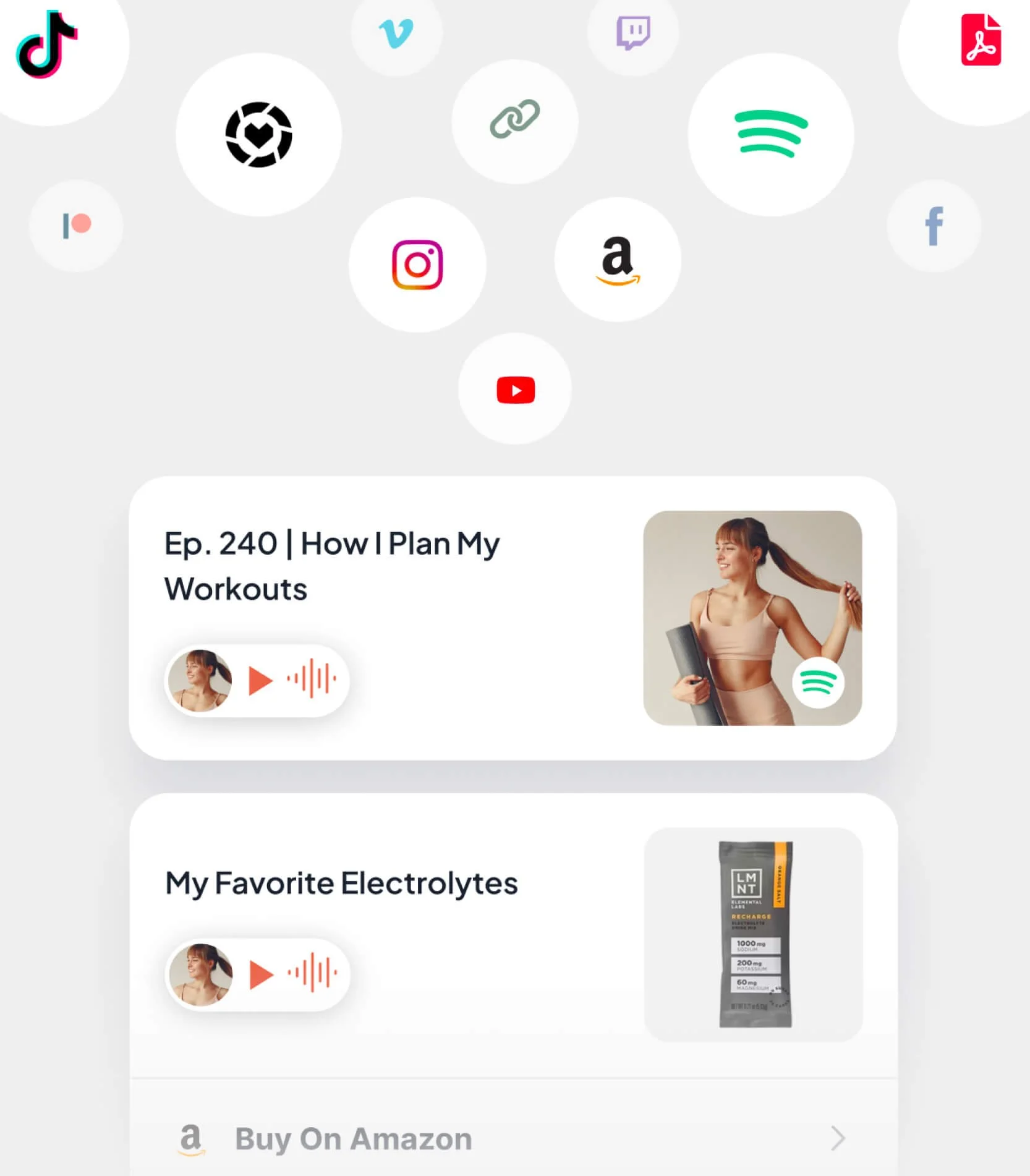 Audio, video, text, images, docs, product recs, articles, social posts, podcast episodes & beyond. Perfect for repurposing all your existing content!